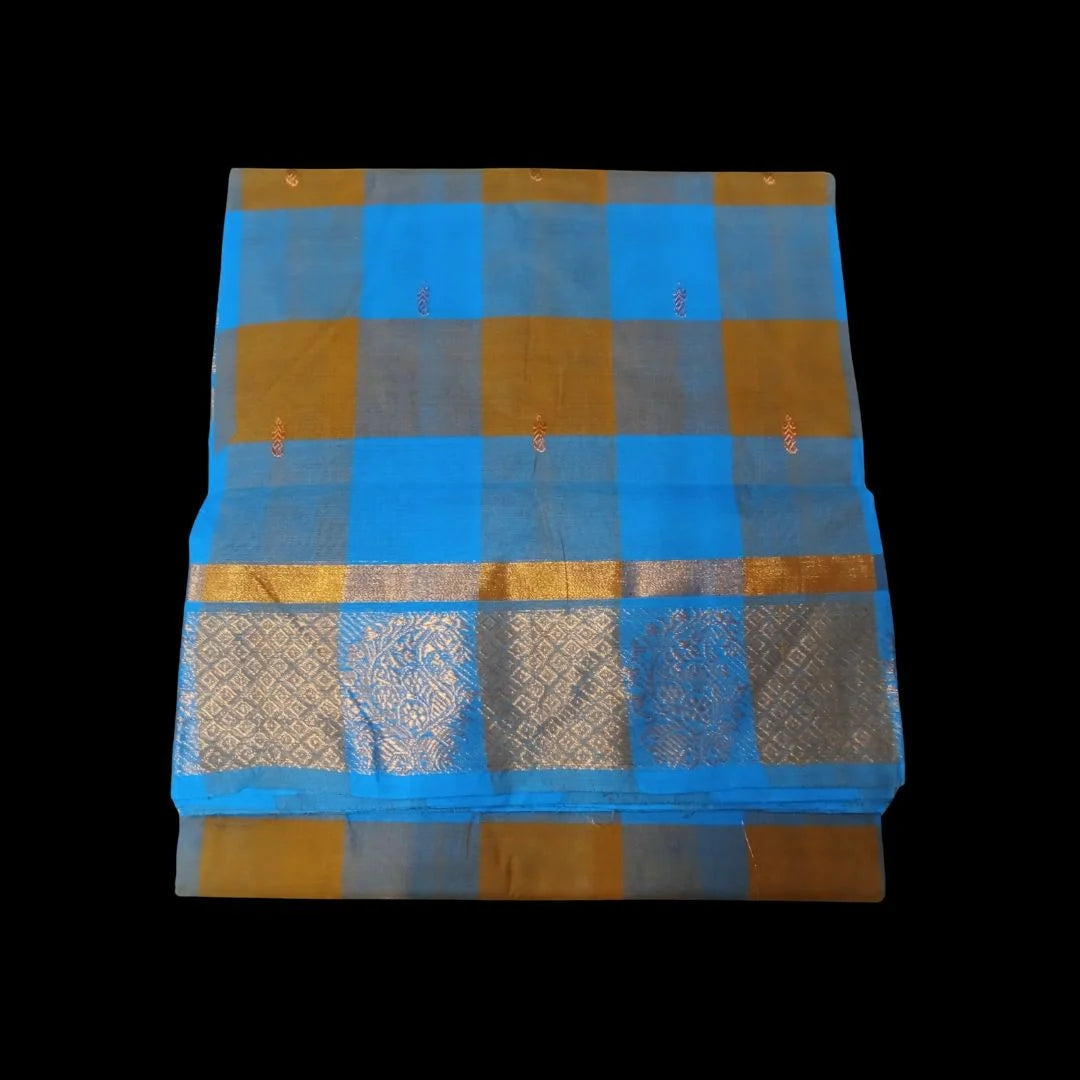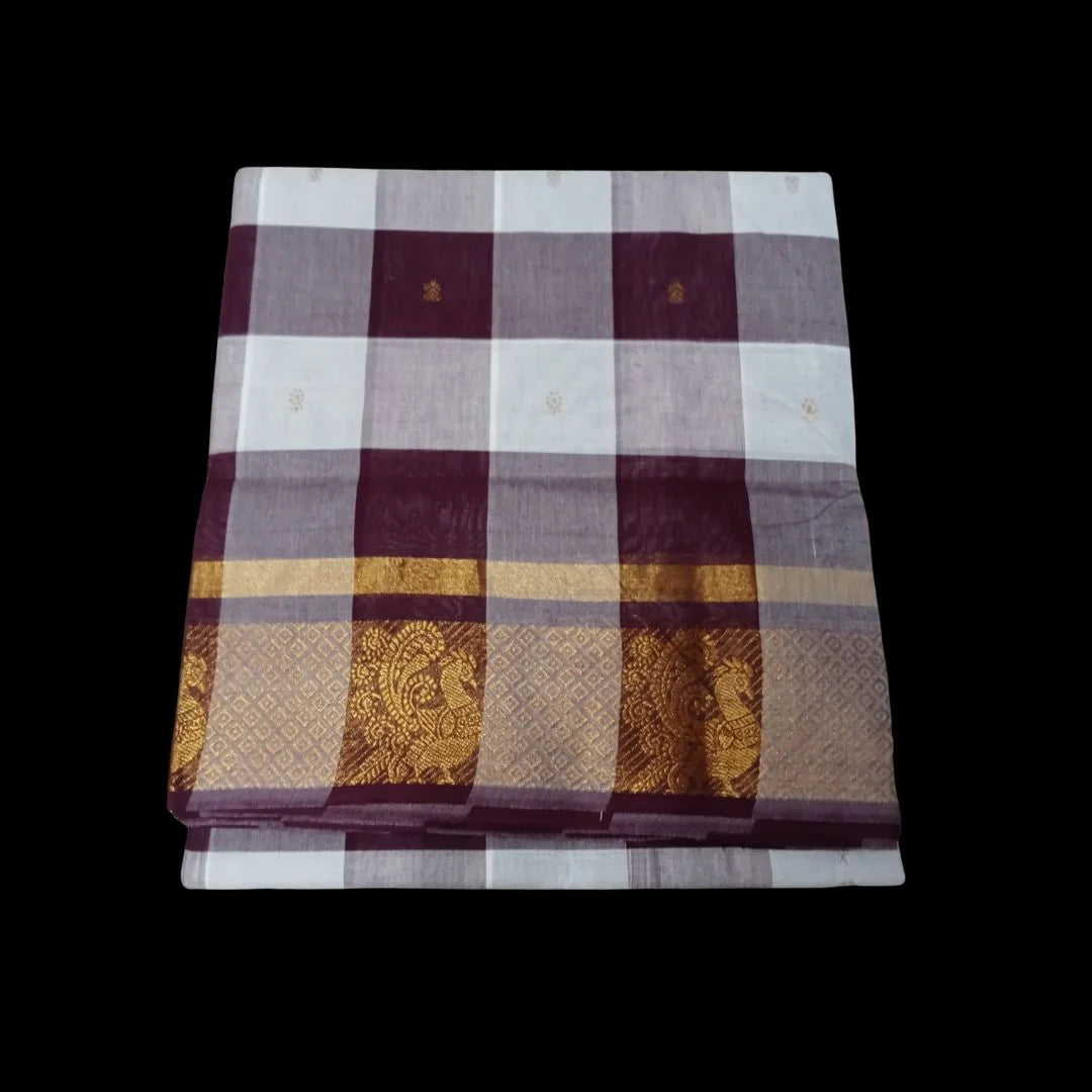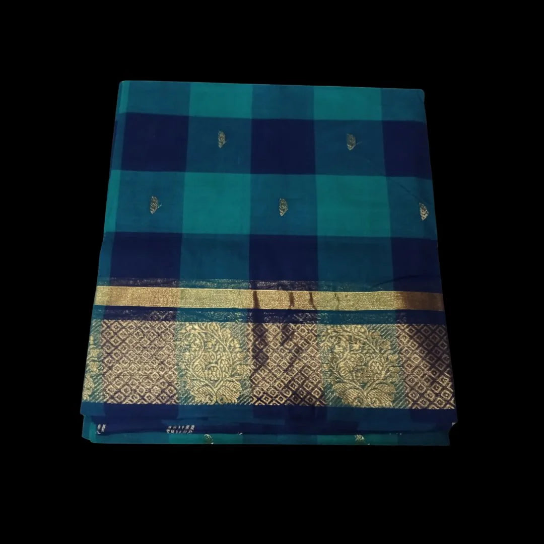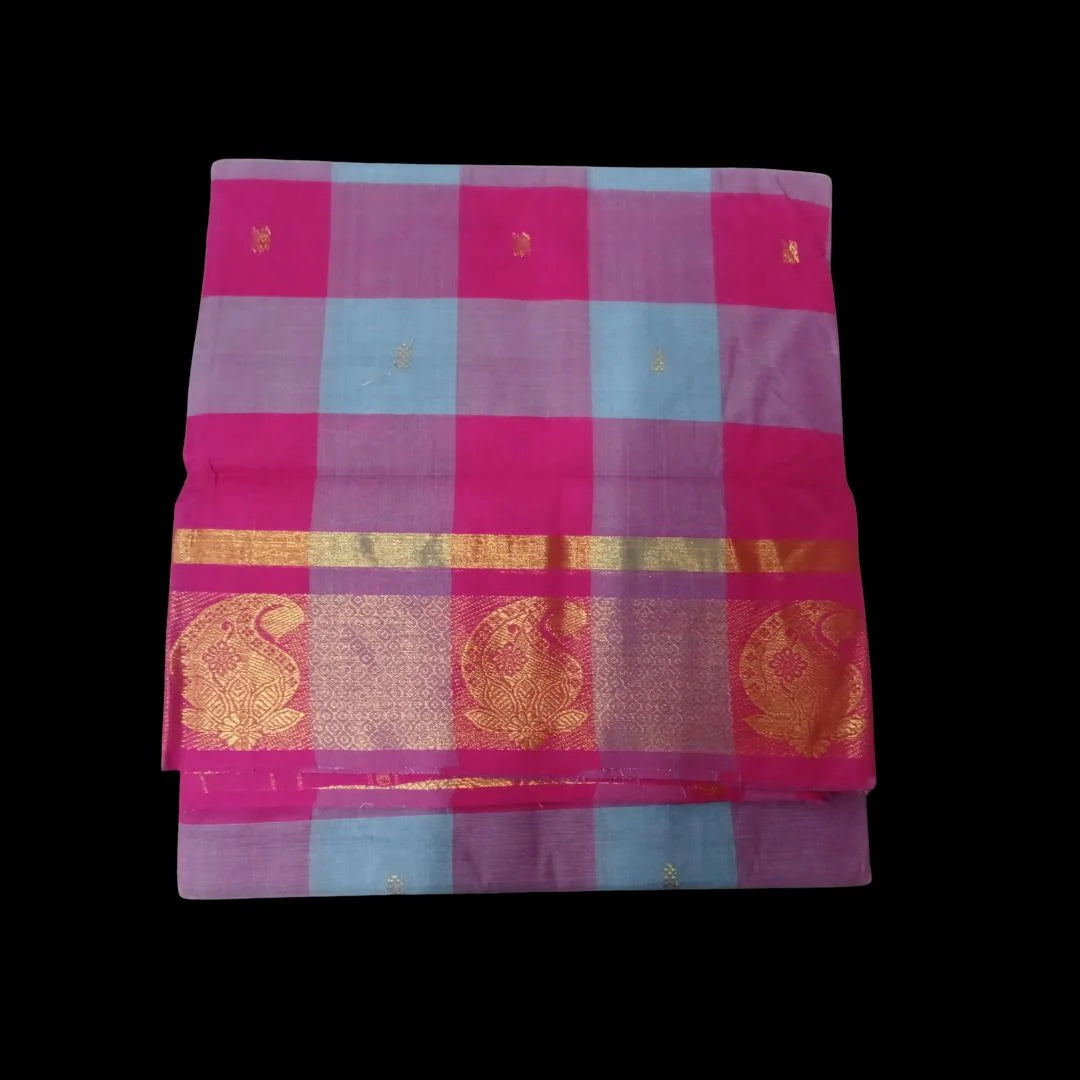 The Chettinad Akalya Checks Butta Cotton Saree is crafted from superior cotton yarn and features an elegant border, offering a refined and stylish look for any occasion. The texture ensures maximum comfort, allowing the wearer to enjoy both ease and sophistication.