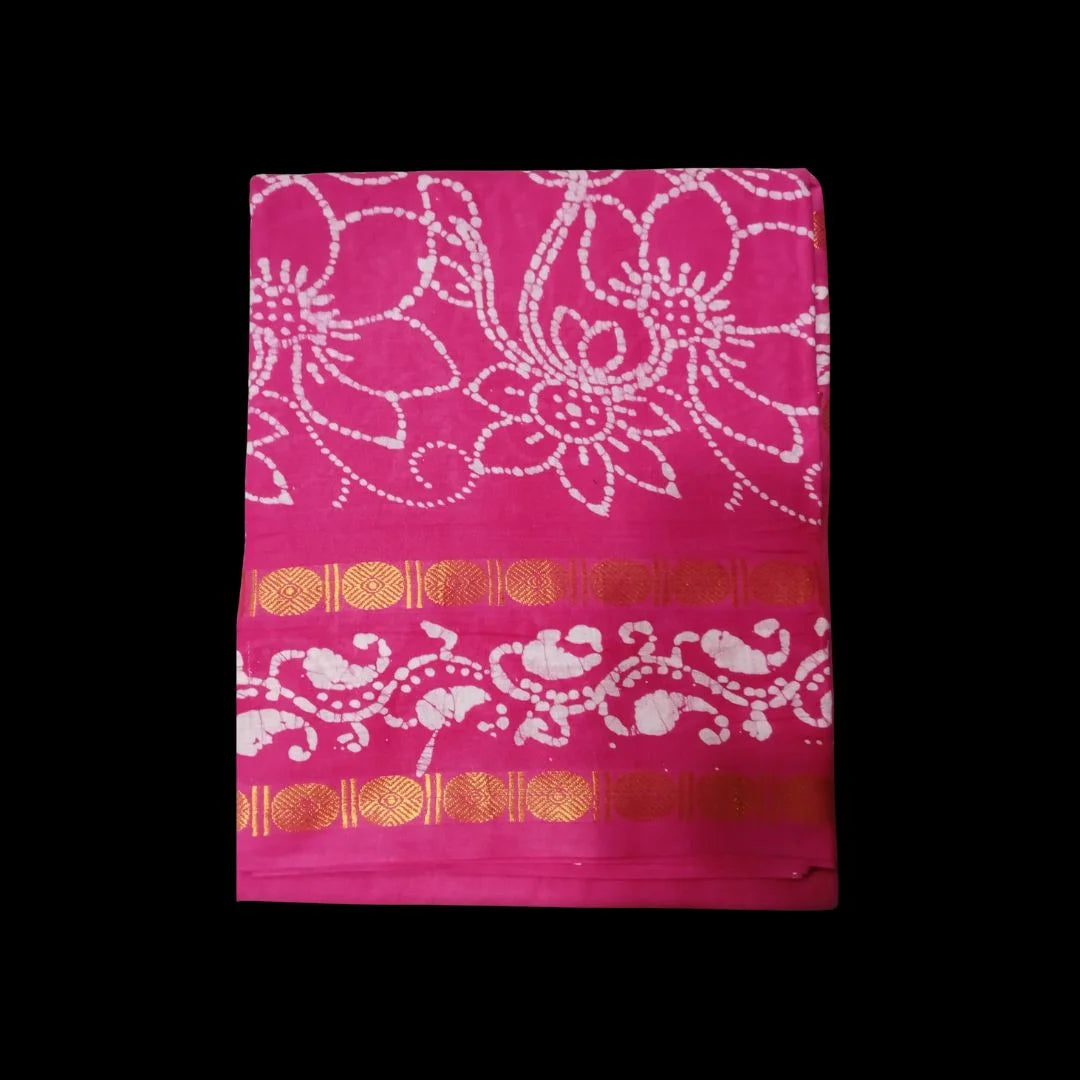 The Madurai Poonam Kodi Wax Cotton 6 yards Sarees bor Saree is crafted from superior cotton yarn and features an elegant border, offering a refined and stylish look for any occasion. The texture ensures maximum comfort, allowing the wearer to enjoy both ease and sophistication.