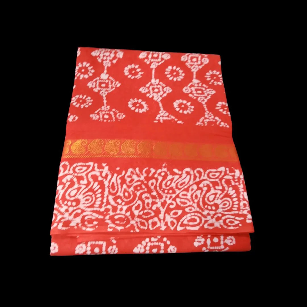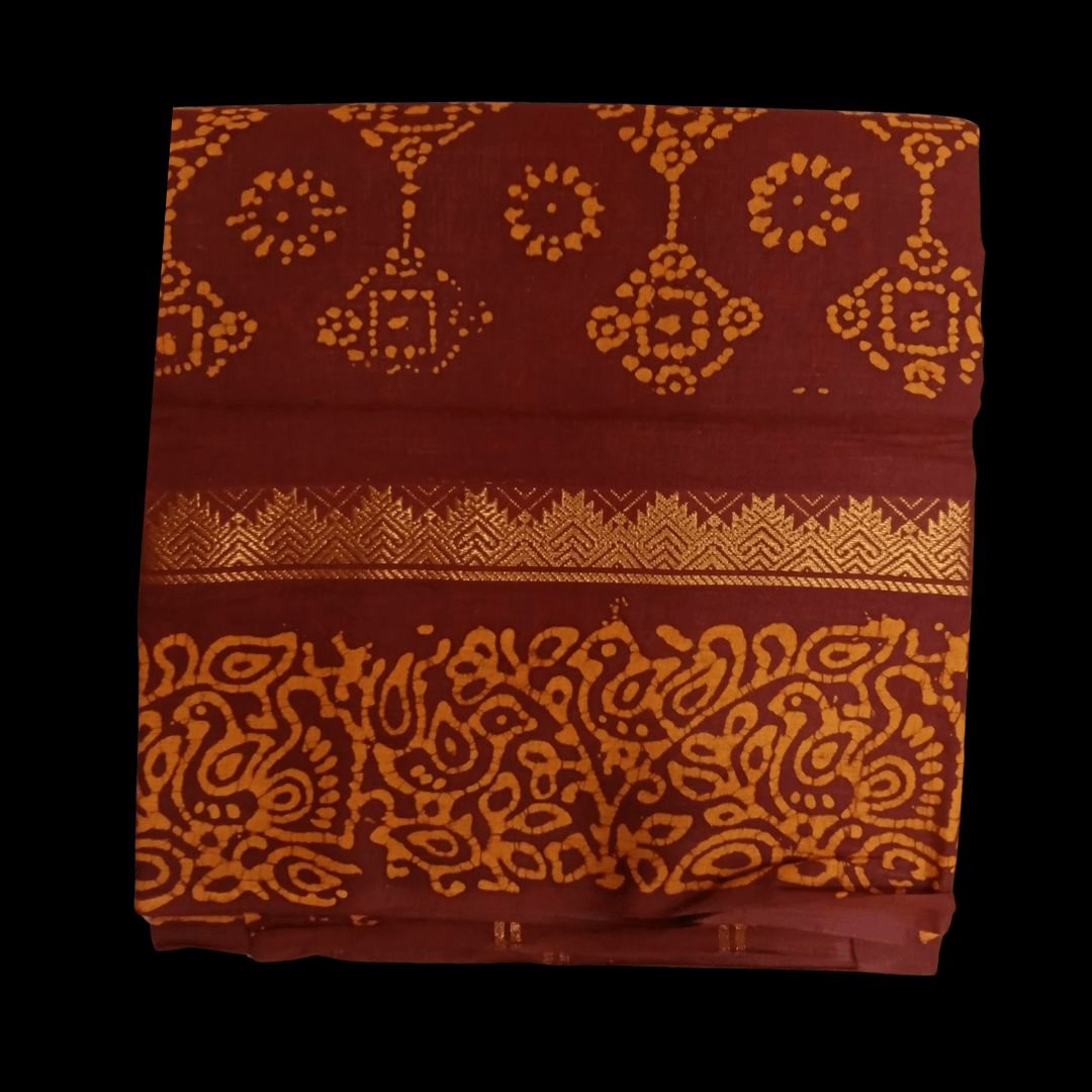 The Madurai Poonam Kodi Wax Cotton 6 yards Sarees bor Saree is crafted from superior cotton yarn and features an elegant border, offering a refined and stylish look for any occasion. The texture ensures maximum comfort, allowing the wearer to enjoy both ease and sophistication.