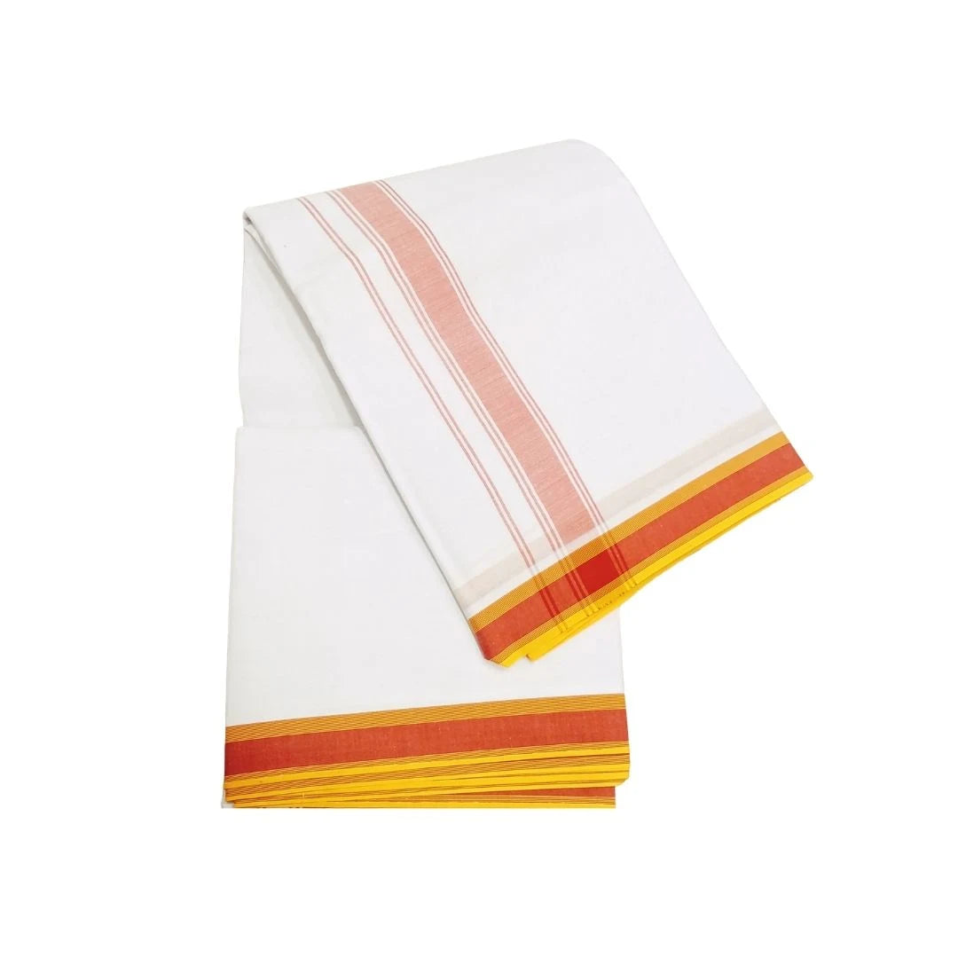 The Men Premium Panchakacham Dhoti is crafted from superior Cotton blend dhoti yarn and features an elegant plain colour border, offering a refined and stylish look for any occasion. The texture ensures maximum comfort, allowing the wearer to enjoy both ease and sophistication. Whether for religious ceremonies, weddings, or festive events, this dhoti adds a touch of traditional while providing lasting comfort throughout the day